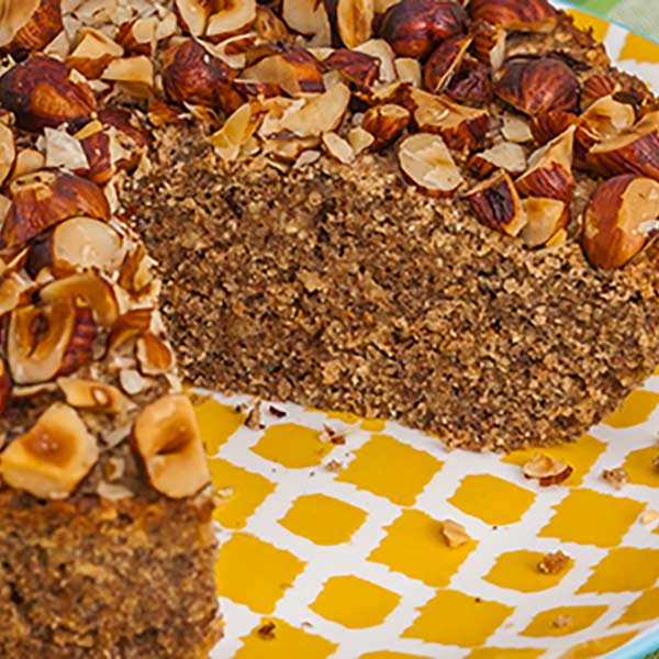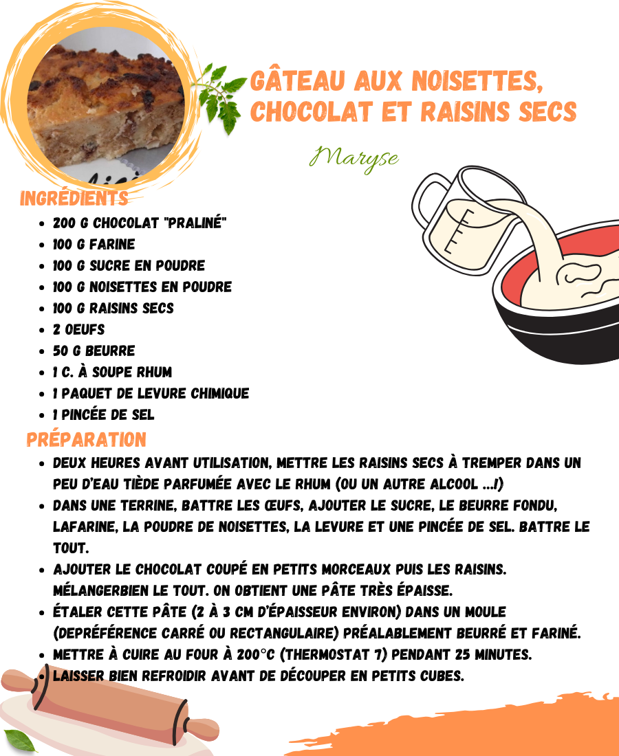 Gâteau aux noisettes, chocolat et raisins secs